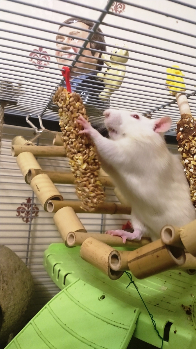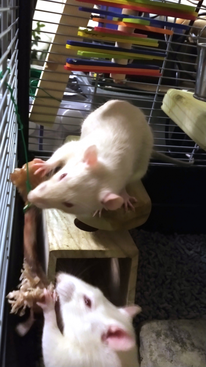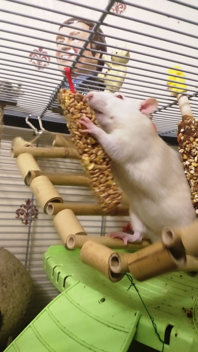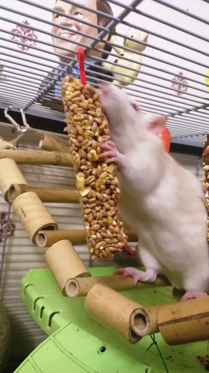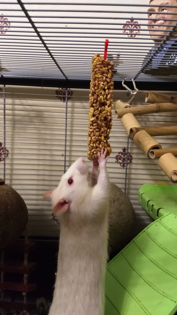 The carrot nibble stick was bought from Tesco and they enjoy it a lot. The packaging says it should be an occasional treat despite coming with a plastic hook to hang it with, so I hang it in their cage just for short periods. Ronnie and Derek also have a honey nibble stick, bought from Carrefour during a Calais day trip, which permanently hangs in their cage as they’re not massively keen and so only nibble on it occasionally.