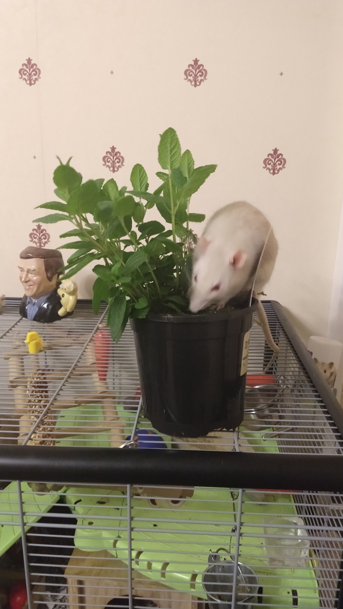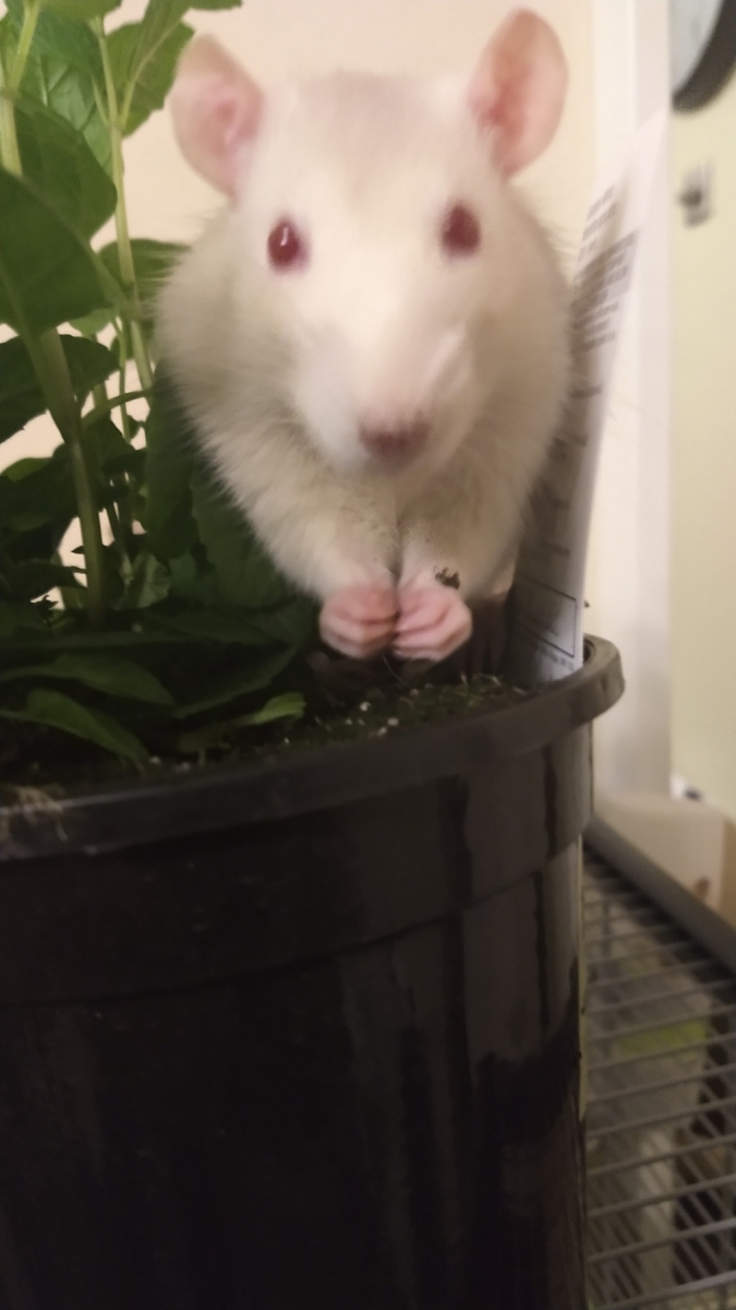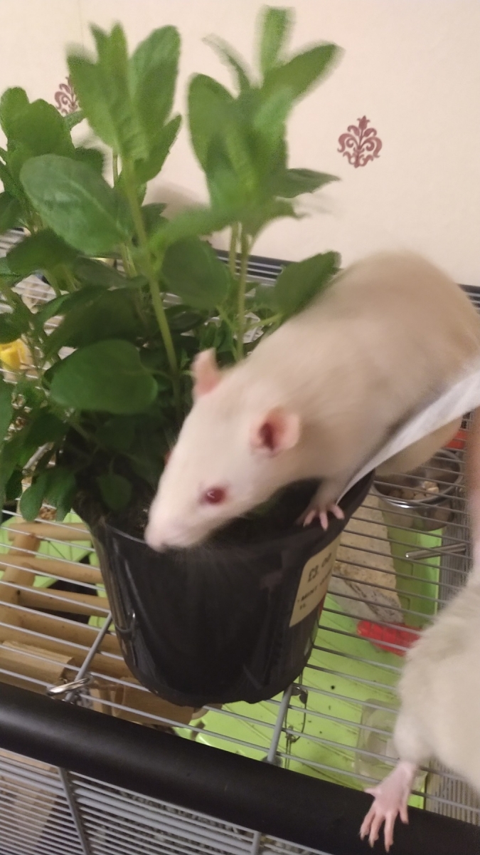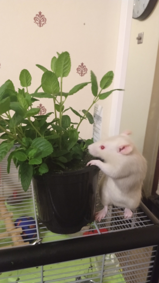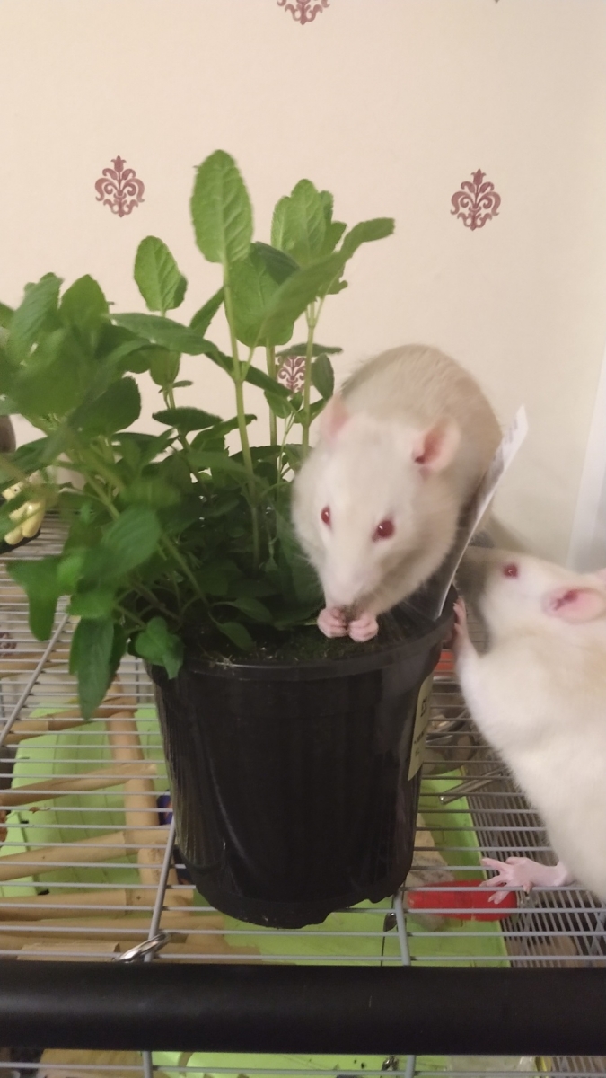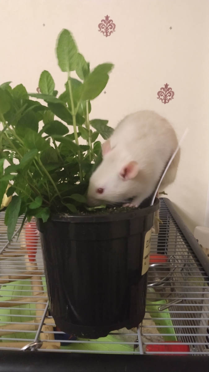 Rats enjoy eating herbs and I bought a mint plant which Ronnie and Derek were interested to explore. Ronnie ate some mint but wasn’t very impressed, but Derek loves it and had a good time searching through the leaves and picking some to eat. Watch the videos and photos below!